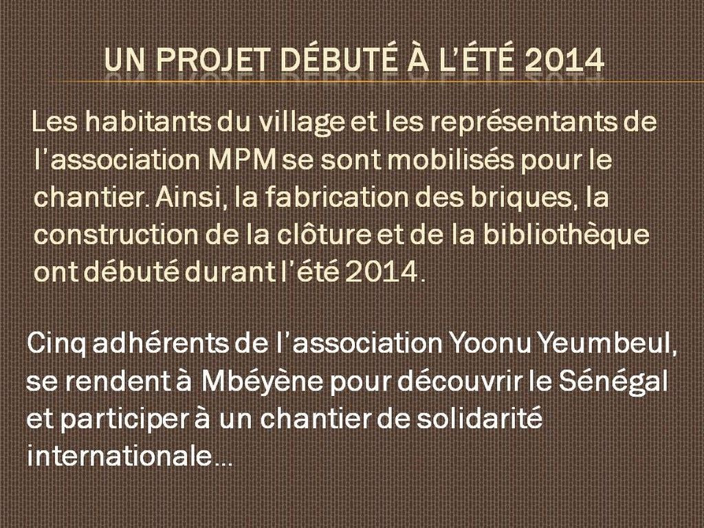 En 2014, un groupe de 5 adhérents sont partis au Sénégal pour participer à un chantier de construction d’une bibliothèque dans le village de Mbéyène.
